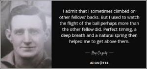 Cazaly was famous for his ability to take spectacular marks despite his small stature, and, at South Melbourne, teammates Fred “Skeeter” Fleiter and Mark “Napper” Tandy, would simultaneously yell “Up there, Cazzer”, originating the phrase that would become synonymous with Australian rules football. He initially developed his marking ability by jumping at a ball strung up in a shed at his home, and held his breath as he jumped, an action that he believed lifted him higher. He also possessed the capacity to kick a football over 65 metres In 2009,